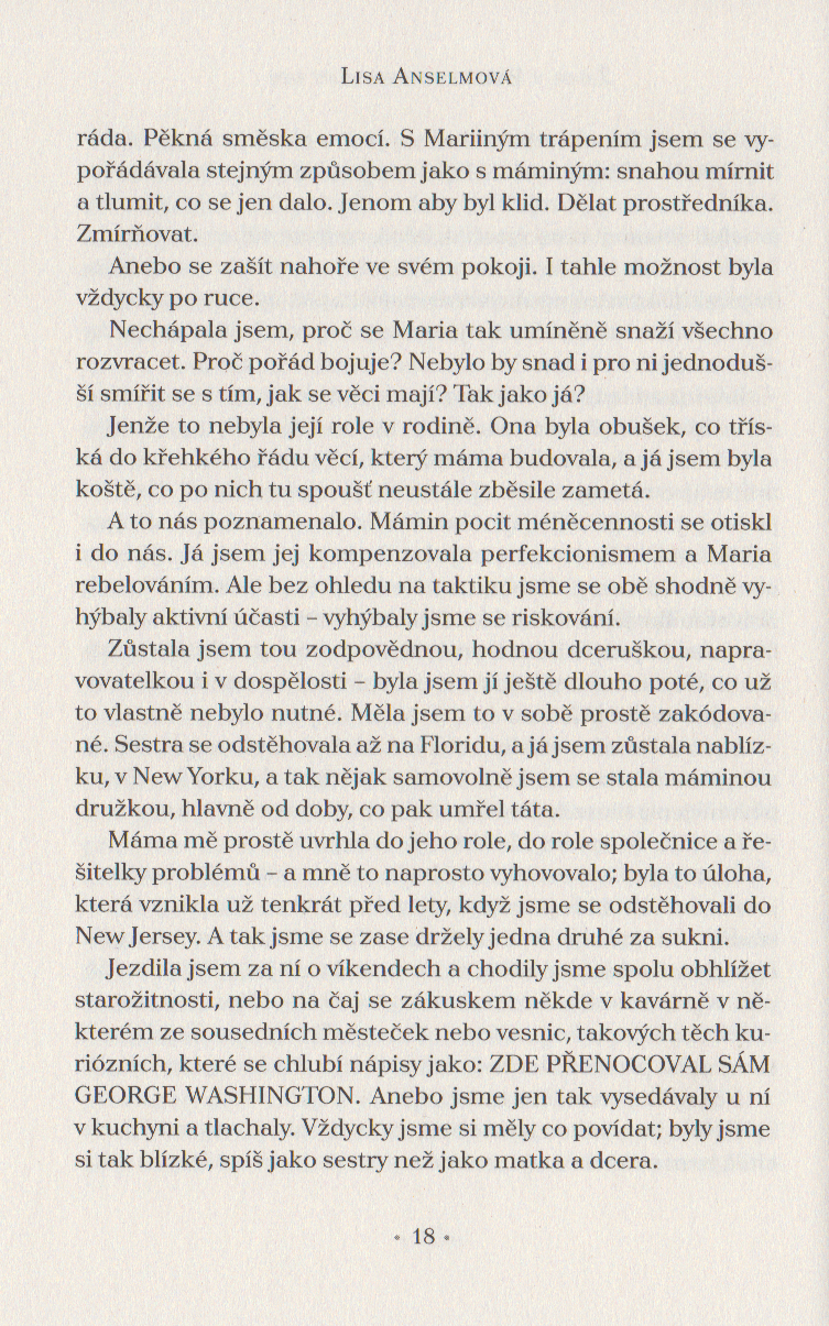 Newyorčanka Lisa žije dlouhá léta v těsném sepětí se svou milovanou, ale svéráznou matkou, která má na dceru velký - možná až moc velký - vliv. Teprve když matka zemře, si Lisa začne uvědomovat, že si vlastně nevybudovala žádný osobní život. Pokouší se najít smysl své existence a klade si otázku, kým je bez matky a jejích očekávání.