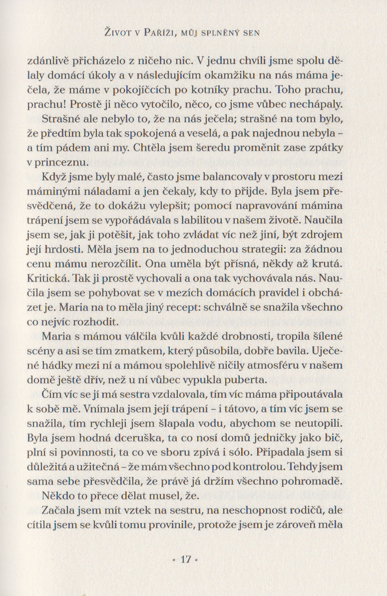 Tak opravdu nebudu lhát, tuto knihu jsem četla tři měsíce a to ještě s donucením, protože nemám ráda, když něco nedočtu. Pro mě tam bylo málo "akce", nějaká zápletka nebo něco. Anoooo chapu, že autorka vyprávěla svůj životní příběh jako by jste s ní seděli u kafíčka (V mém případě u capuccina, mňam! O:) ) a ona vám jen tak vyprávěla co prožila. Ale za to, co mám na této knize ráda je, že je opravdová. Ukazuje to, že když se člověk rozhodne přestěhovat a žít v cizí zemí, tak nelítá pořád jen na růžovém obláčku, ale má tam i určité problémy, které se musí řešit. Co se mi opravdu líbilo, tak byl vztah s jejími Pařížskými přáteli, bylo to uvolněné a nikdo si na nic nehrál. Občas v některých částech jsem se i zasmála, ale jinak mě kniha nijak neohromila. Určitě ji doporučuji pro milovníky Paříže, cestování a těm, kteří mají rádi tyto typy knih.